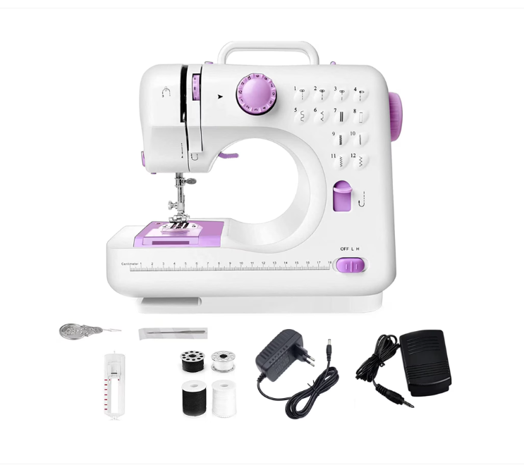 Mini masina de cusut portabila cu pedala, alimentare cu baterii sau la retea, alba