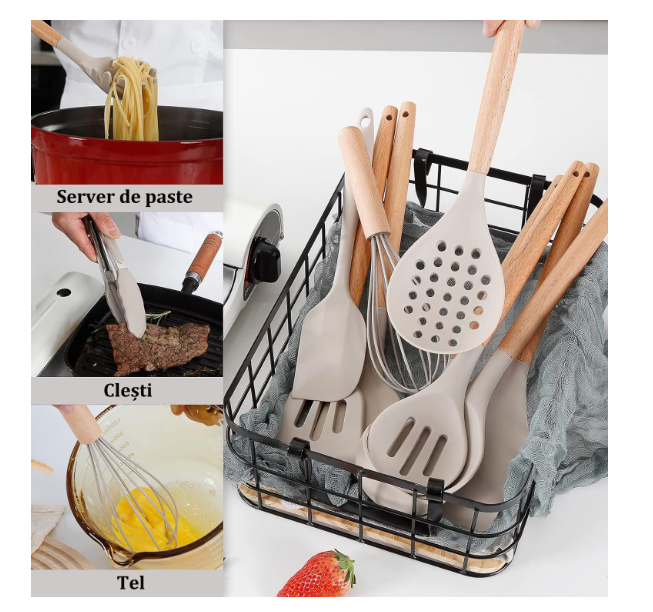 RASPUNDETI PE PLEIN NEVOIILE DVS. DE BUCATARIE, NU MAI RIPIDE BANI - Setul de ustensile din silicon include 12 unelte de gatit si un suport mare pentru ustensile.