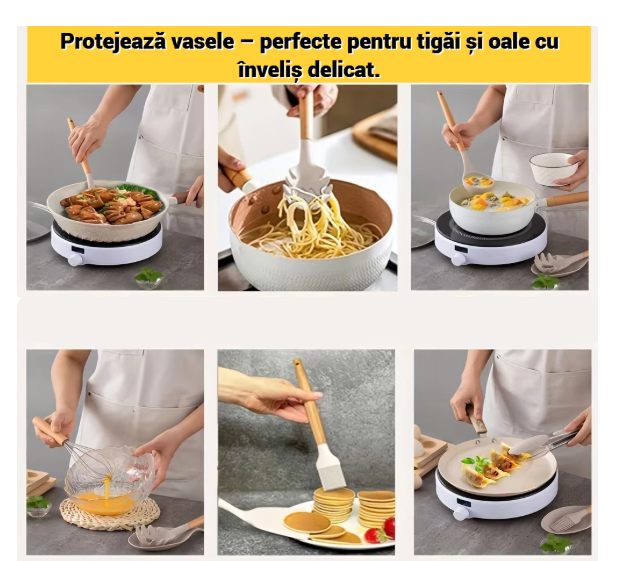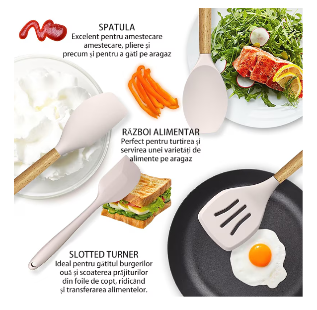 REZISTENT LA CALDURA, NETOPIT, MANER DIN LEMN - Setul de ustensile de gatit din silicon sunt rezistente la caldura pana la 230°C, asigurandu-se ca nu se vor topi si nu vor produce fum chiar si la prajirea la temperaturi ridicate. Manerul confortabil din lemn previne transferul de caldura, oferind o experienta de gatit sigura. Acesta este setul de gatit de baza pentru o casa sau un apartament nou. Va rugam sa retineti ca fiecare maner din lemn are o culoare si o textura usor diferite.