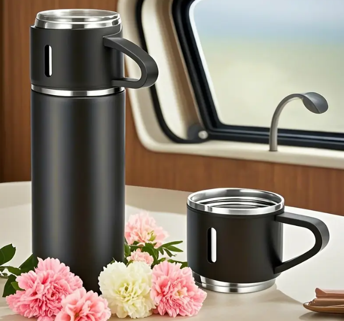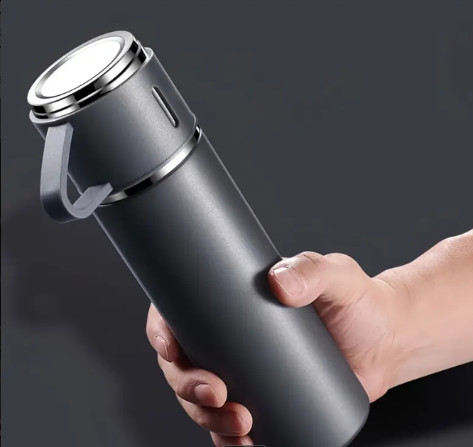 Surprinde-ti familia sau prietenii cu acest set cadou termos cu 3 cesti, un cadou elegant si practic pentru orice ocazie. Cu un design modern din otel inoxidabil, acest set nu doar ca arata bine, dar este si extrem de functional. Termos-ul este proiectat pentru a pastra bauturile la temperatura ideala pentru pana la 12 ore — fie ca vrei sa te bucuri de un ceai fierbinte sau o bautura racoritoare.
