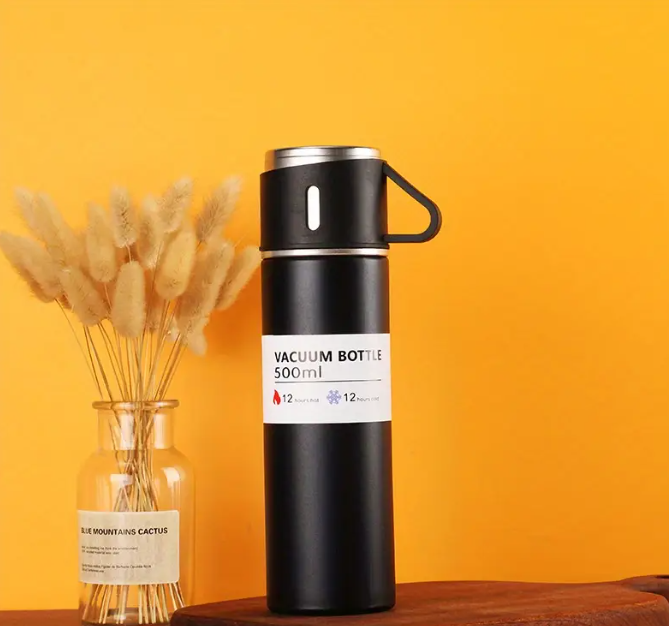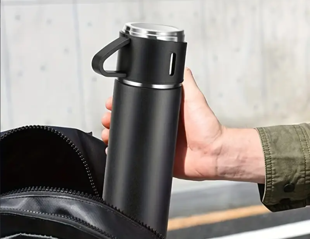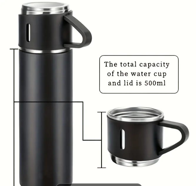 Set cadou termos cu 3 cesti DIGIMAT®, calitate garantata, inchidere ermetica, fara scurgeri, Otel inoxidabil, ambalaj premium, special pentru birou, natura, drumetii, picnic sau intr-o calatorie cu masina, 500 ML, Negru