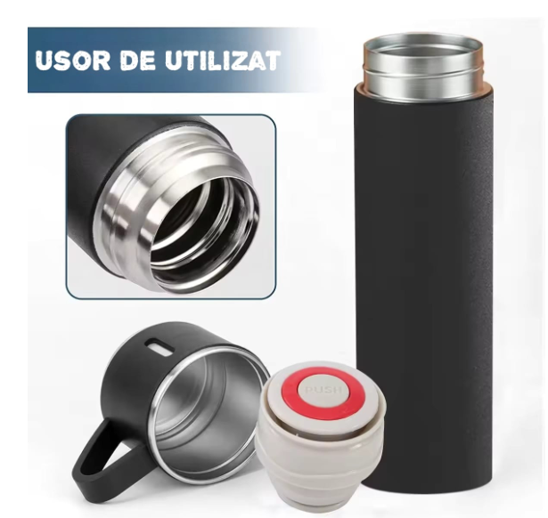 Dimensiuni termos: 22,5 cm inaltime, 6,5 cm diametru, capacitate de 500 ml. Greutate neta: 320g.