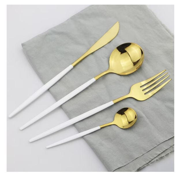 Set tacamuri in stil portughez 24 piese, otel inoxidabil, auriu/alb,
